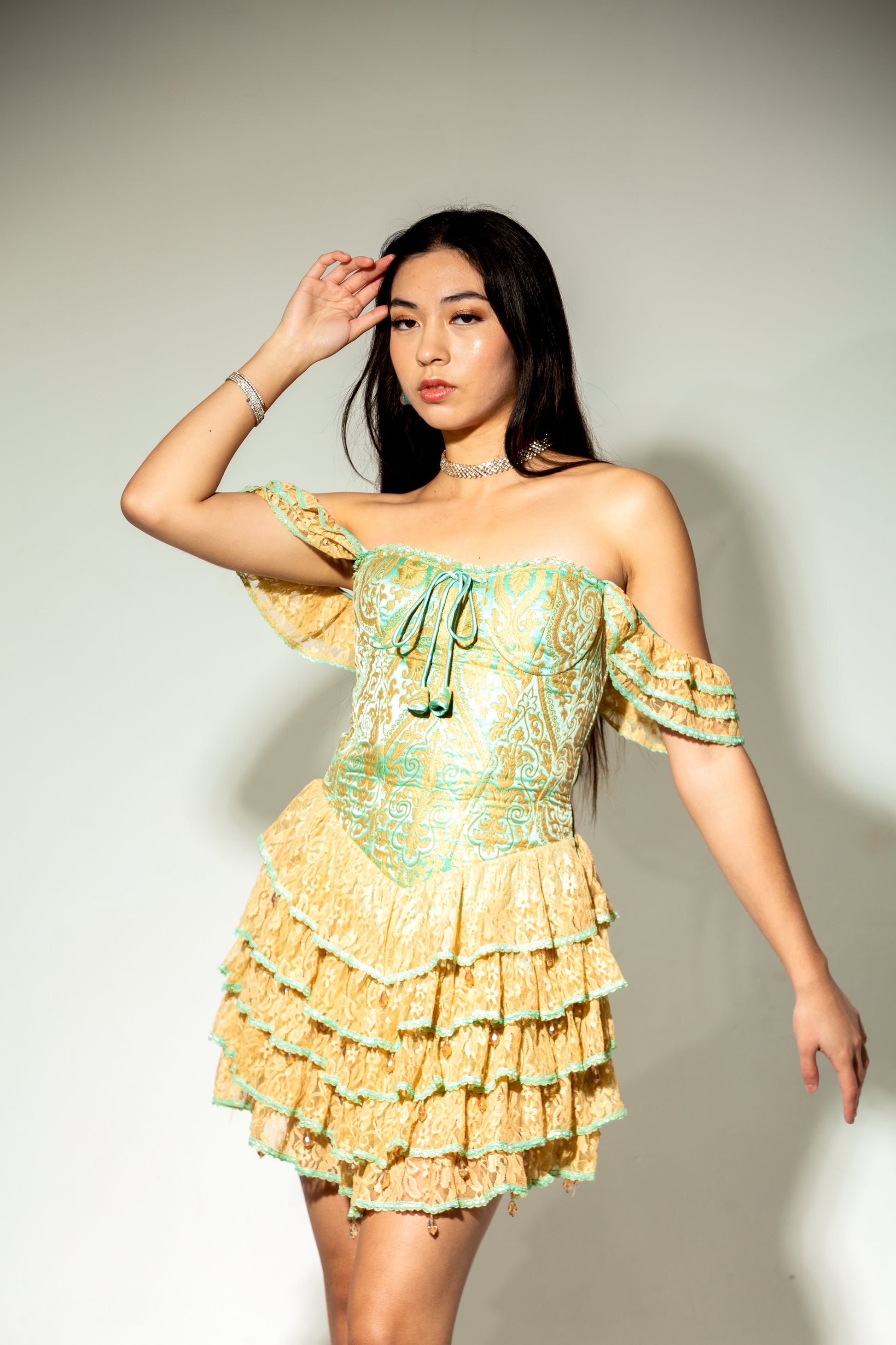 -multitiered lace ruffle sleeves can be worn comfortably on or off shoulder