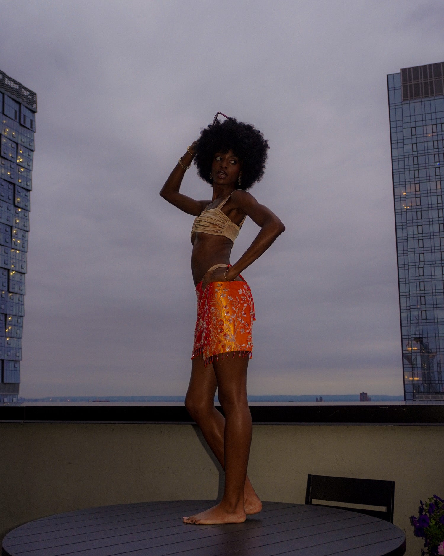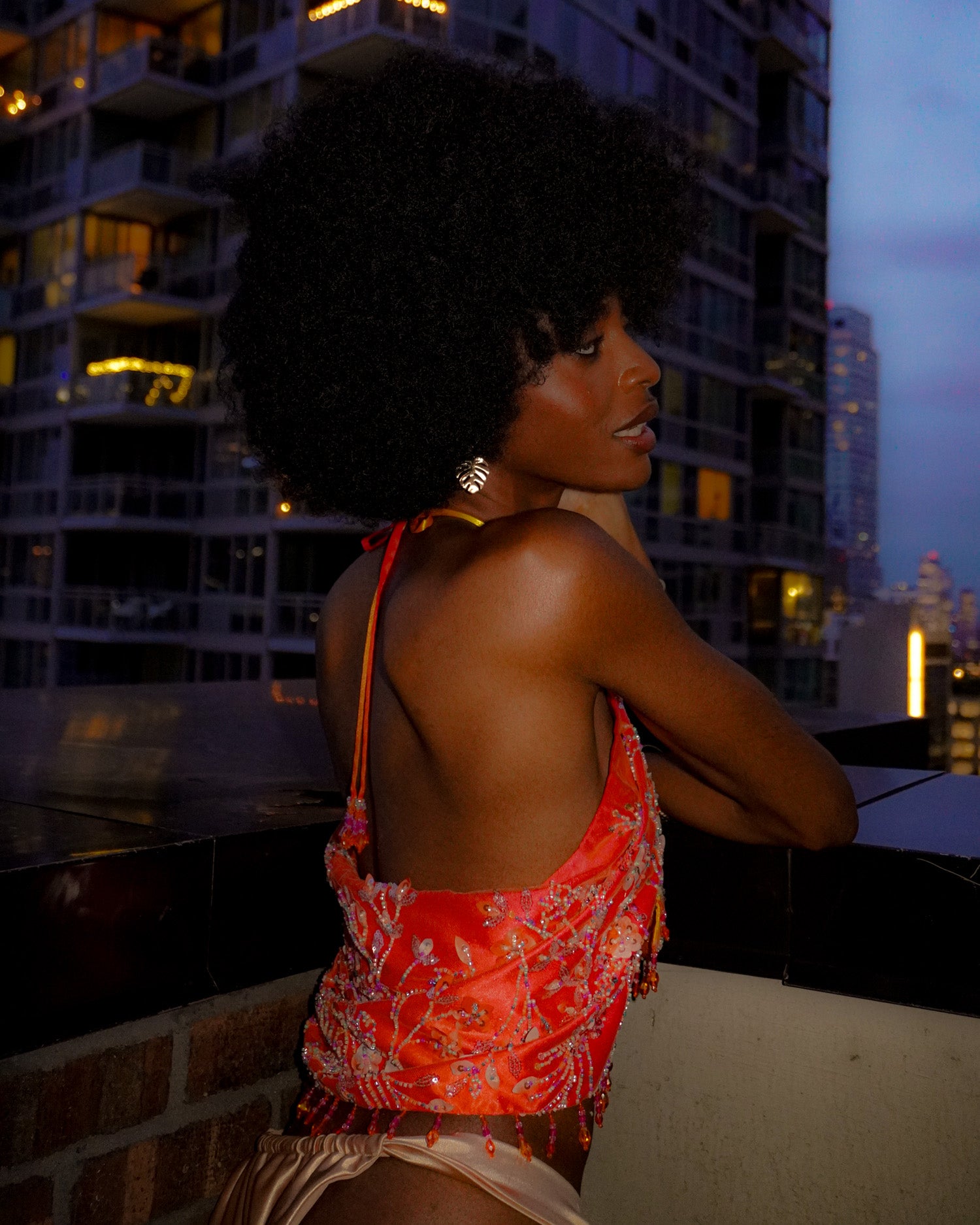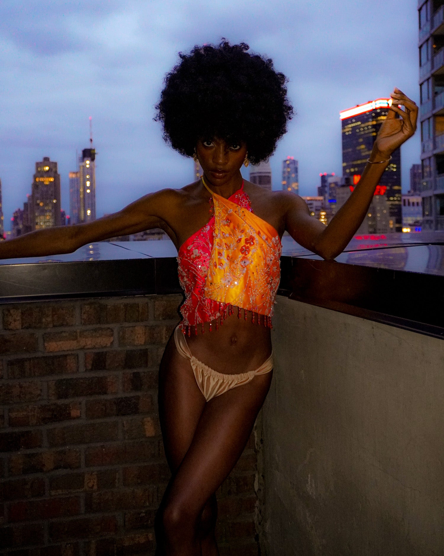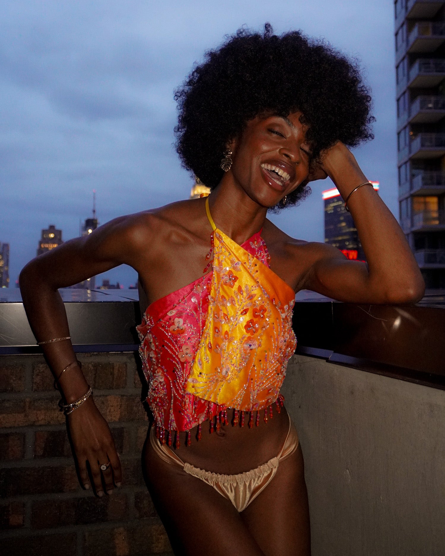 The ultimate convertible statement piece — hand-beaded, satin-lined, and glowing in ombré sunset tones.