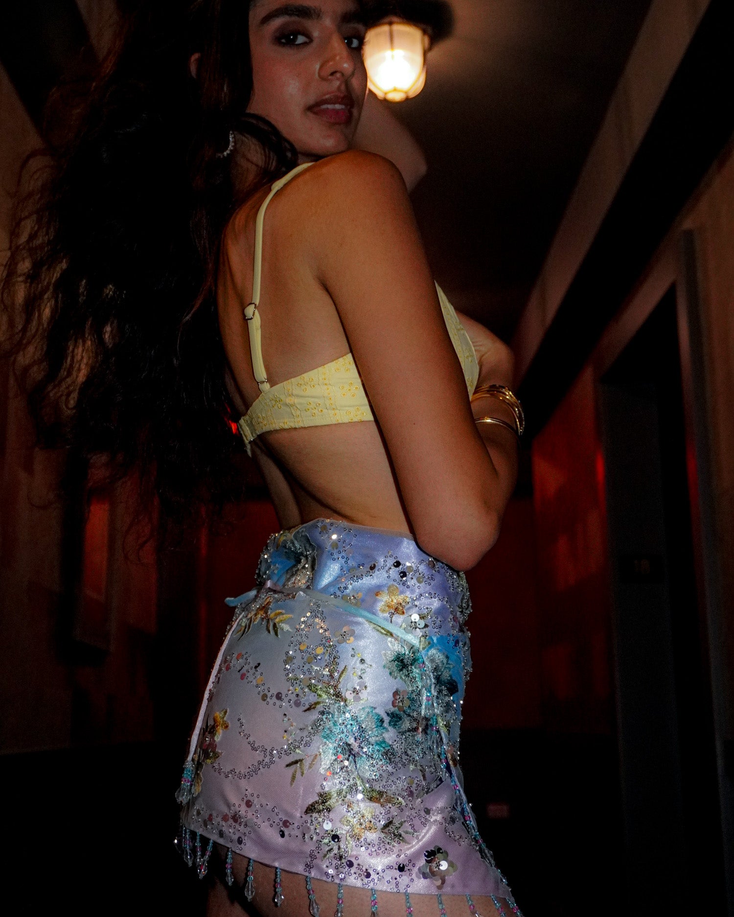 This elevated version of our iconic scarf top is a masterclass in technique and elegance. Handcrafted with meticulous embroidery and dripped crystal beading along every edge, it blends shades of lavender, soft pink, and icy blue in a graceful ombré inspired by moonlight on water.