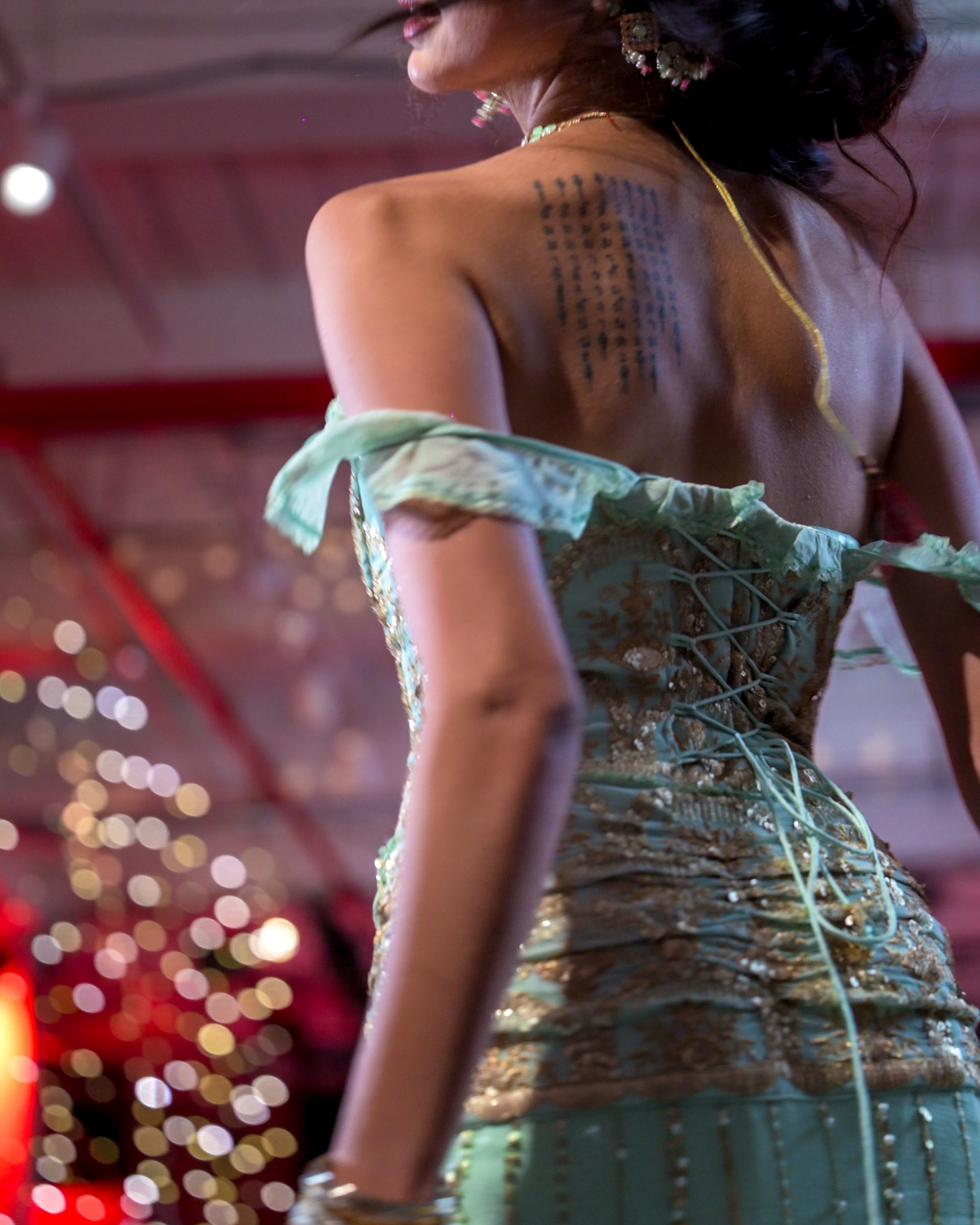 -gold sequin hand-embroidery on light teal